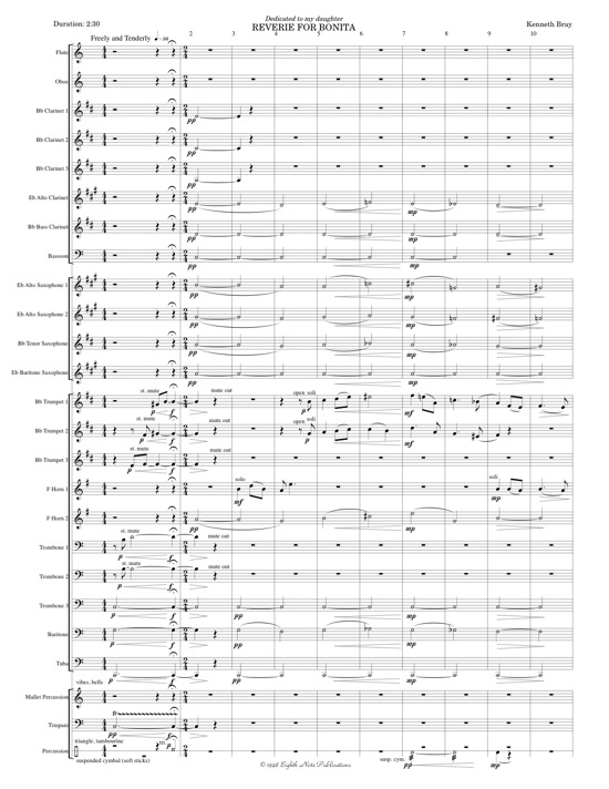 A lush and beautiful work composed by Kenneth Bray for his daughter, Reverie for Bonita features the horn section, colourful use of mutes and simple, elegant themes. Showing off the lyrical side of the band, this work is an ideal "mood change" on a concert. |