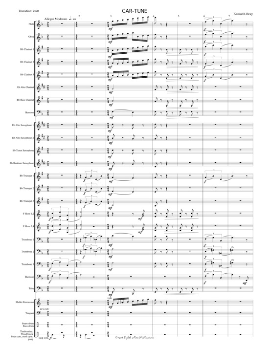 This is a fun closer or encore to a concert and is a feature for the baritone player in your ensemble. The name "Car-Tune" refers to the sound of the horn of the old sports cars. This is a thrilling original by Kenneth Bray that shows off his musical sense of humour and his creative scoring of colourful percussion. It is full of surprises and is a sure success at the end of a concert. |