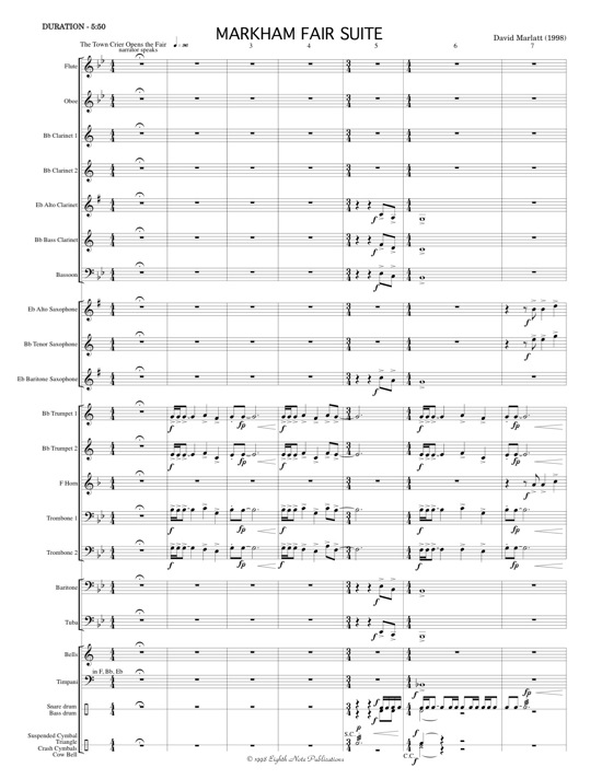 This set of short pieces depicts events that occur annually at fairs all across North America. Ferris wheels, cotton candy, and a fanfare to open the fair are all included. Unique to this short suite is Old McDonald's Barn, a popular viewing event with children found at the Markham Fair. In this movement, animal noises are emulated within the group. This work is not too difficult and is very interesting and fun for all players. Every section in the band is featured and gets a chance to perform some melodic material. |