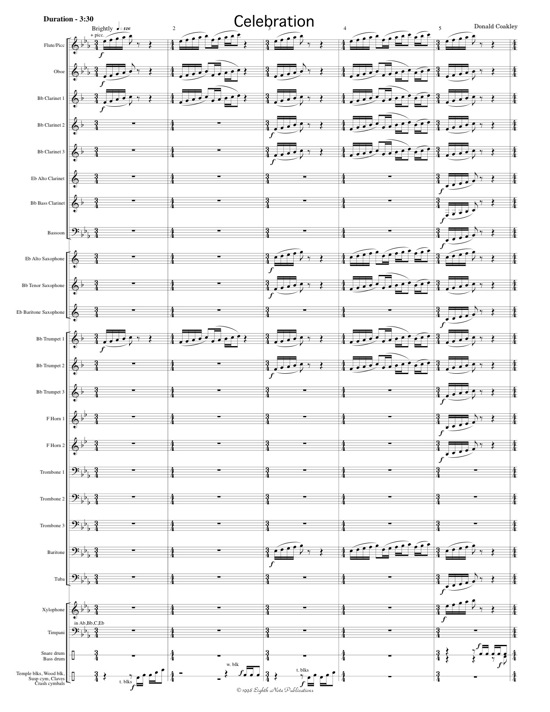 A dynamic work by a dynamic Canadian composer. Full of rhythmic and melodic interest, this concert band original is a fantastic addition to the repertoire. The tuneful melody is passed throughout the ensemble and even low woodwinds and tubas have a short section of melody. Percussion parts animate the driving rhythms and elegant writing in the winds. Another great work by this talented composer, Celebration is a sure success on a concert or to win a competition. |