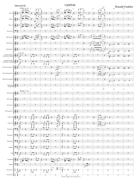 Another exciting composition by an exciting Canadian composer. Donald Coakley wrote Cantos in the 1970s and has now corrected previous errors in print and altered some sections. The title Cantos derives from that form of poetry in which a poem, in many cases epic in nature, consists of many short verses. The four movements are very short and contain interesting material for all players. Originally conceived as a piece for wind ensemble, this piece would work well in either a wind ensemble or concert band setting. |