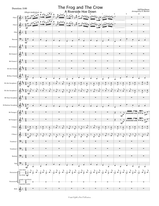 This is a fun and light change of pace in a concert. The Frog and the Crow was originally a choral piece that was so popular, a band version was demanded. It is sub-titled "A Riverside Hoe-Down" and there are interesting parts for all. This tune is fun for both players and audiences. |