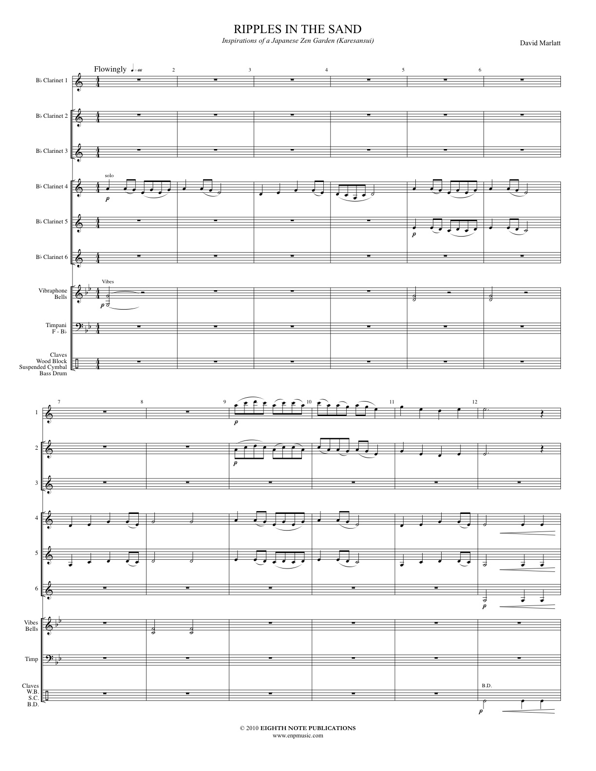 A karesansui is a Japanese rock garden which is an enclosed shallow sandbox containing sand, gravel and rocks. The main elements are rocks and sand, with the sea symbolized not by water but by sand raked in patterns that suggest rippling water. This short work, for 6 clarinets and optional percussion, is peaceful, reflective and accessible to audiences. The major pentatonic scale is used as the basis for this composition which creates an interesting texture and evokes the sound of an ancient Japanese folk song. |