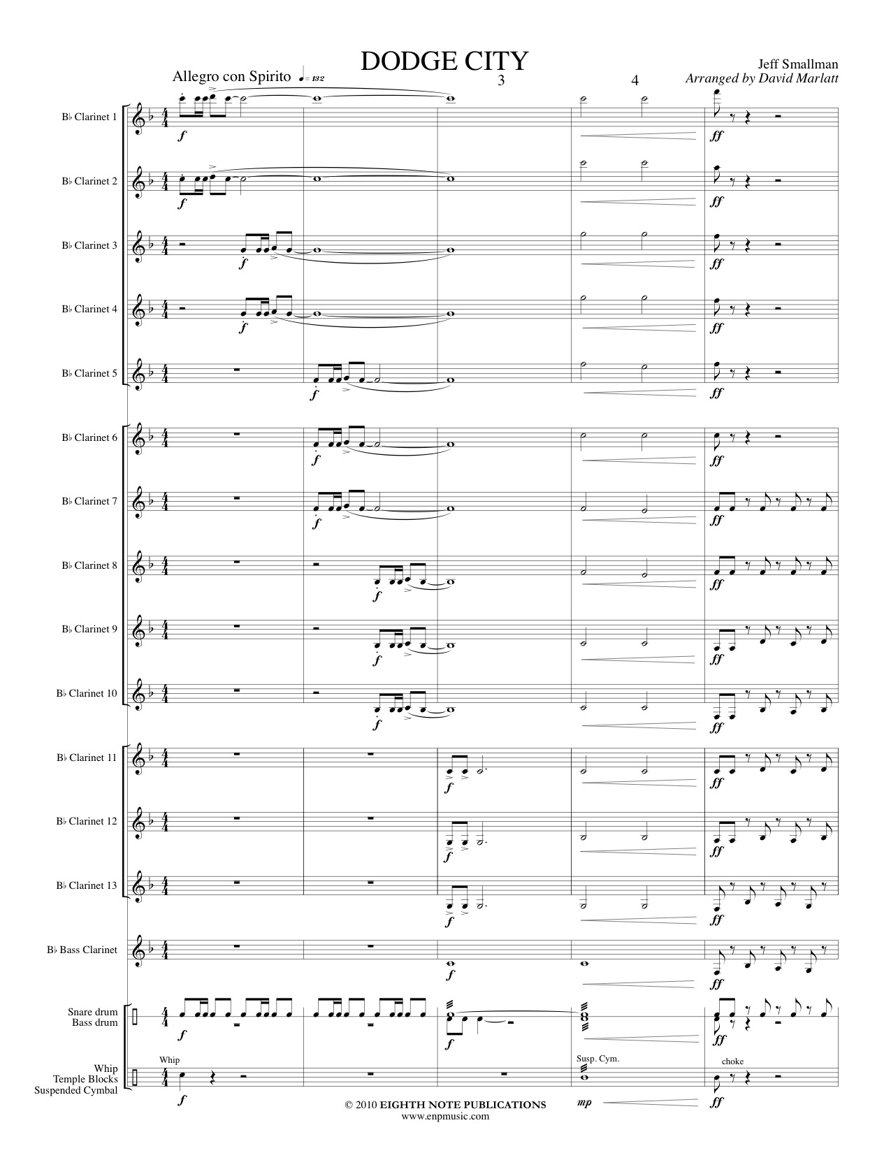 Dodge City is an exuberant piece, arranged here for 13 clarinets, bass clarinet and optional percussion, designed to take you back to the time of the old west. As the title implies, this is a work that will bring to mind stagecoaches and sagebrush, cowboys and cactus, sheriffs and showdowns. Quick and lighthearted, the opening and closing sections frame a lyric middle section. Dodge City has captured the atmosphere of a bustling city from the old west and is sure to captivate performers and audiences alike. |