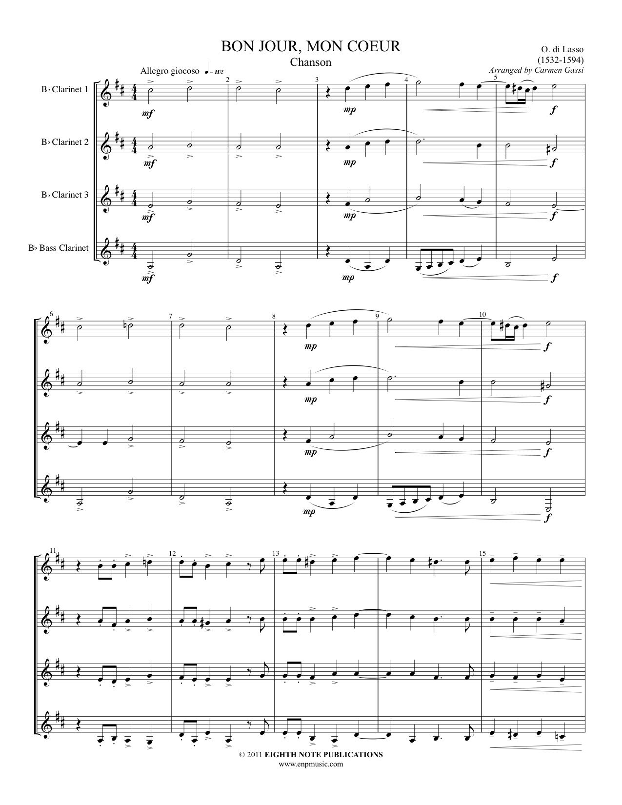 Your clarinet ensemble will enjoy the distinctive Renaissance harmonies in this approachable setting of the chanson written by Orlando di Lasso. |