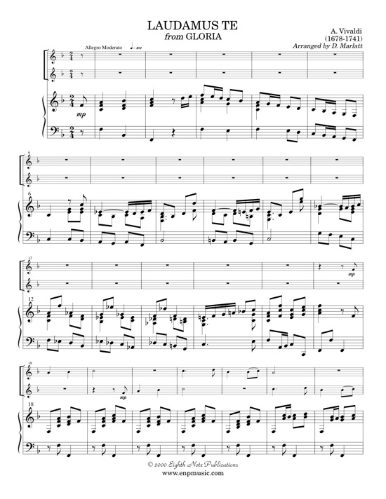 The Gloria by Antonio Vivaldi is truly a magnificent work. The Laudamus Te is a vocal duet arranged here for 2 clarinets and keyboard (organ or piano). This duet is typical of the music of the Vivaldi with imitative scale passages and melodic lines cleverly intertwining. |