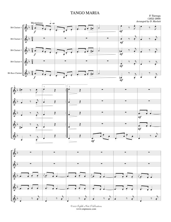 This Spanish piece was originally written for guitar. It might sound like a stretch to arrange a piece from guitar to clarinet quintet but this really works! The flavour is preserved and the parts are not too difficult. Add something different to your next concert. |