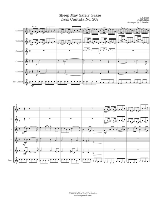 This is the most famous section from Bachrs Cantata No. 208. It has been arranged here for 5 b-flat clarinets and 1 bass clarinet. Are parts are interesting and none are too difficult. |
