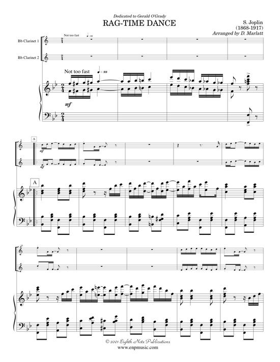 This is another famous Joplin rag which has been arranged here for 2 clarinets and piano. The piano part remains in the original key and clarinets play the famous melodic lines above the steady bass. The clarinets and piano alternate melodic sections. Sometimes the piano plays alone and sometimes the clarinets play the melody with the piano adding newly composed, stylistically accurate counter melodies. |