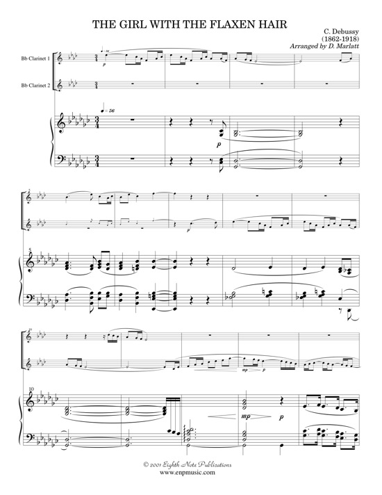 This famous piano work by Debussy lends itself very well to wind instruments. The flowing melodic line combined with the distinctive Debussy harmonies make this a great new arrangement for 2 clarinets and keyboard. The keyboard part would obviously be suitable for the piano but if performed on the organ, a whole new dimension of sound is created. |