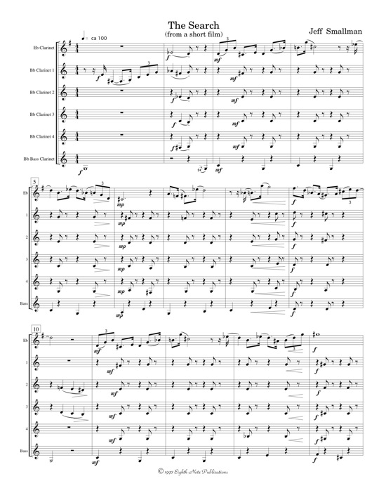 The Search was written for a short film produced in 1995 in Vancouver, but due to time constraints was never included in the finished film. The Search was composed as background music portraying the comic aspects of two characters' search for employment. Scored for a clarinet choir consisting of 1 e-flat clarinet, 4 b-flat clarinets and 1 bass clarinet, this piece is easily approachable by high school players. In 1997 Dr. Robert Riesling, from the University of Western Ontario, premiered this work in London, Ontario. |