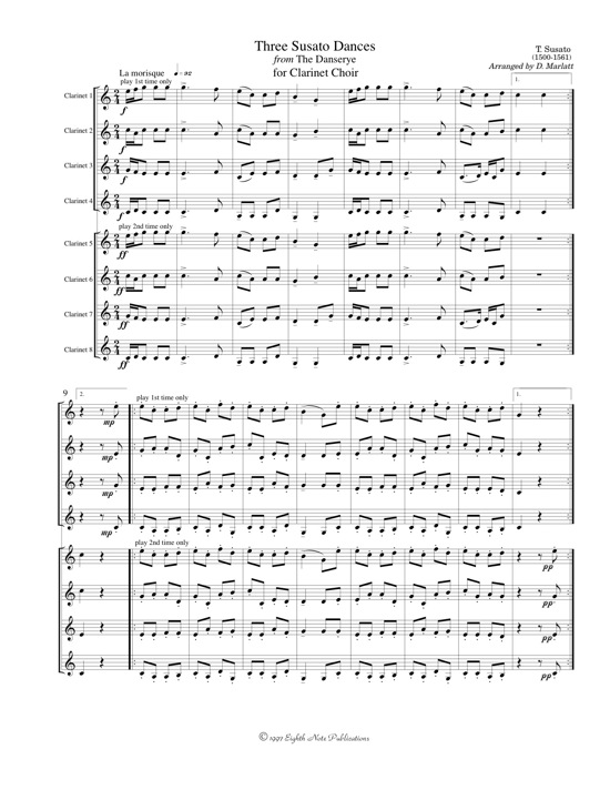 Originally for 4 recorders, this piece was made famous in the brass world by several arrangements by members of the Philip Jones Brass Ensemble of England. The brilliant imitative writing lends itself very well to this new arrangement which has been set for 8 clarinets (set in 2 choirs of 4 clarinets each). Dramatic dynamic contrasts and "echo" writing make this a new found classic for easy clarinet choir. |