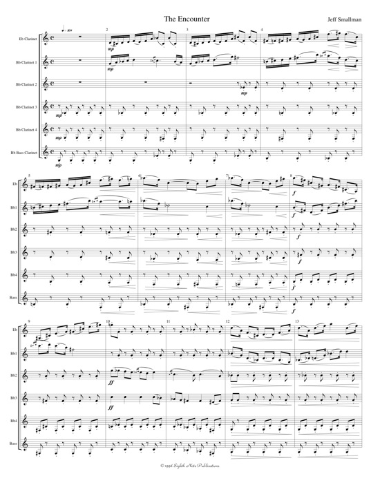 The Encounter was written for a short film produced in 1995 in Vancouver but, due to time constraints, was never included in the finished film. This work is the third in a set of three movements (the first being The Search and the second is unwritten as of yet). Scored for a clarinet choir consisting of 1 e-flat clarinet, 4 b-flat clarinets and 1 bass clarinet, this piece is approachable by high school players. |