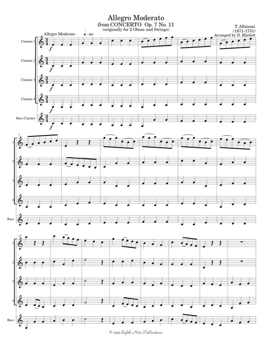 This arrangement for clarinet choir (4 b-flats and 1 b-flat bass) makes a good short piece which is ideal for a high school chamber concert. Originally for two oboes and strings, this piece lends itself well to an all clarinet ensemble. No part is too difficult with the fourth clarinet never crossing the break. |