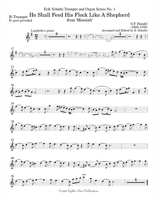 Two famous arias from one of the best known Christmas pieces are elegantly transcribed for e-flat trumpet and organ. Rejoice greatly, O Daughter of Zion contains optional ornaments as heard on the album Music for Trumpet & Organ Volume 2. The beautiful He shall feed his flock is a guaranteed crowd-pleaser with simple long phrases and clear harmonies. These arrangements are ideal for playing at Christmas church services or at weddings.