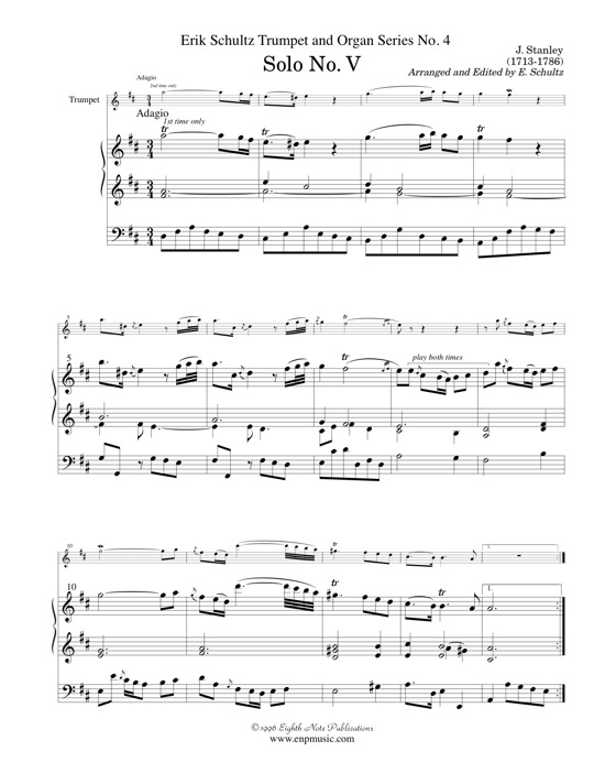 Also found on Mr. Schultzs recording entitled Music for Trumpet and Organ Volume 3 is this Solo by John Stanley. This is a brilliant transcription with colourful organ ornaments and superb piccolo trumpet passages. A beautiful Adagio starts the four movement work and flows into an Allegro with long scalar passages by both trumpet and organ. The middle Adagio is borrowed from Solo IV and the final Gigg has a spectacular opening with the trumpet entering on a high D! Excellent idiomatic organ writing combined with trumpet flourishes, this has become a standard on the Schultz and Overduin tours. |