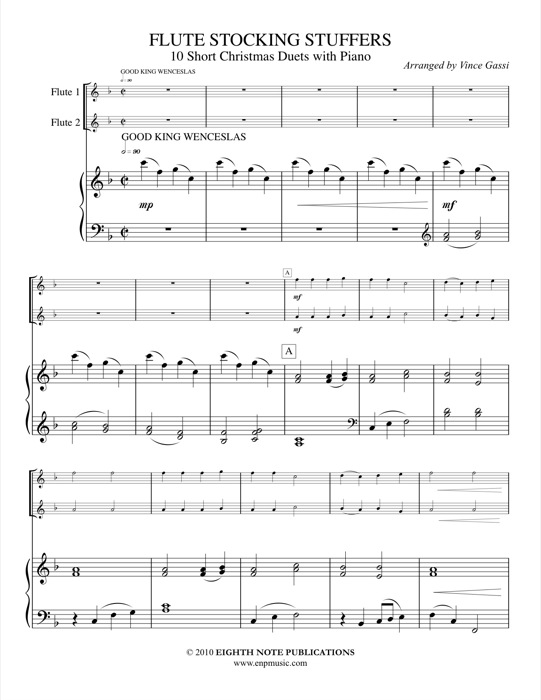 These arrangements are fun and easy and will make a perfect addition to any Christmas concert or holiday celebration. Also available with these arrangements are beautiful, lush orchestral accompaniment tracks available for free download from enpmusic.com or vincegassi.com. These stunning and colorful scorings would make a special addition to a church service or school event. Simply download whichever mp3’s you want and play them through speakers and have the instrumentalists play along. Pieces include: Good King Wenceslas, Holly and the Ivy, Huron Carol, Jingle Bells, O Christmas Tree, Silent Night, Up on the Rooftop, Little Drummer Boy, We Three Kings and Ding Dong Merrily on High.