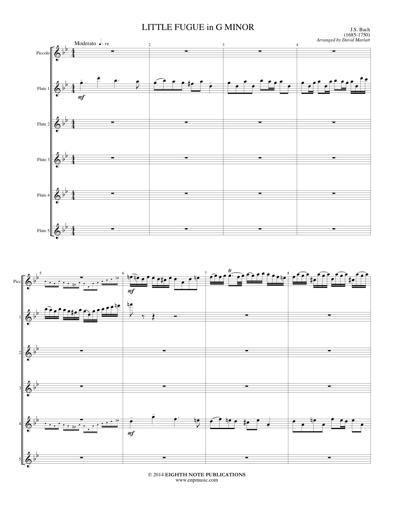 Here is J.S. Bach s most famous fugue arranged for 6 flutes. Great independent parts for all players make this fun to play and a challenge.