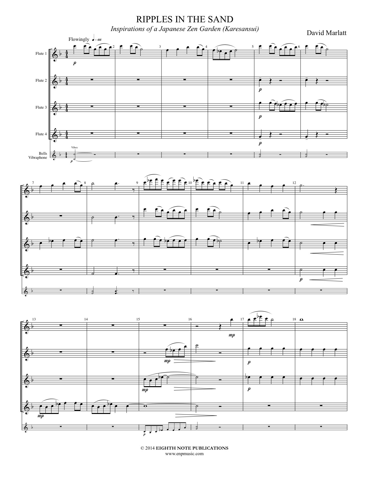 A karesansui is a Japanese rock garden which is an enclosed shallow sandbox containing sand, gravel and rocks. The sea is symbolized, not by water but, by sand raked in patterns that suggest rippling water. This short work is peaceful and reflective and accessible to young musicians. The major pentatonic scale is used as the basis for this composition which creates an interesting texture and evokes the sound of an ancient Japanese folk song.
