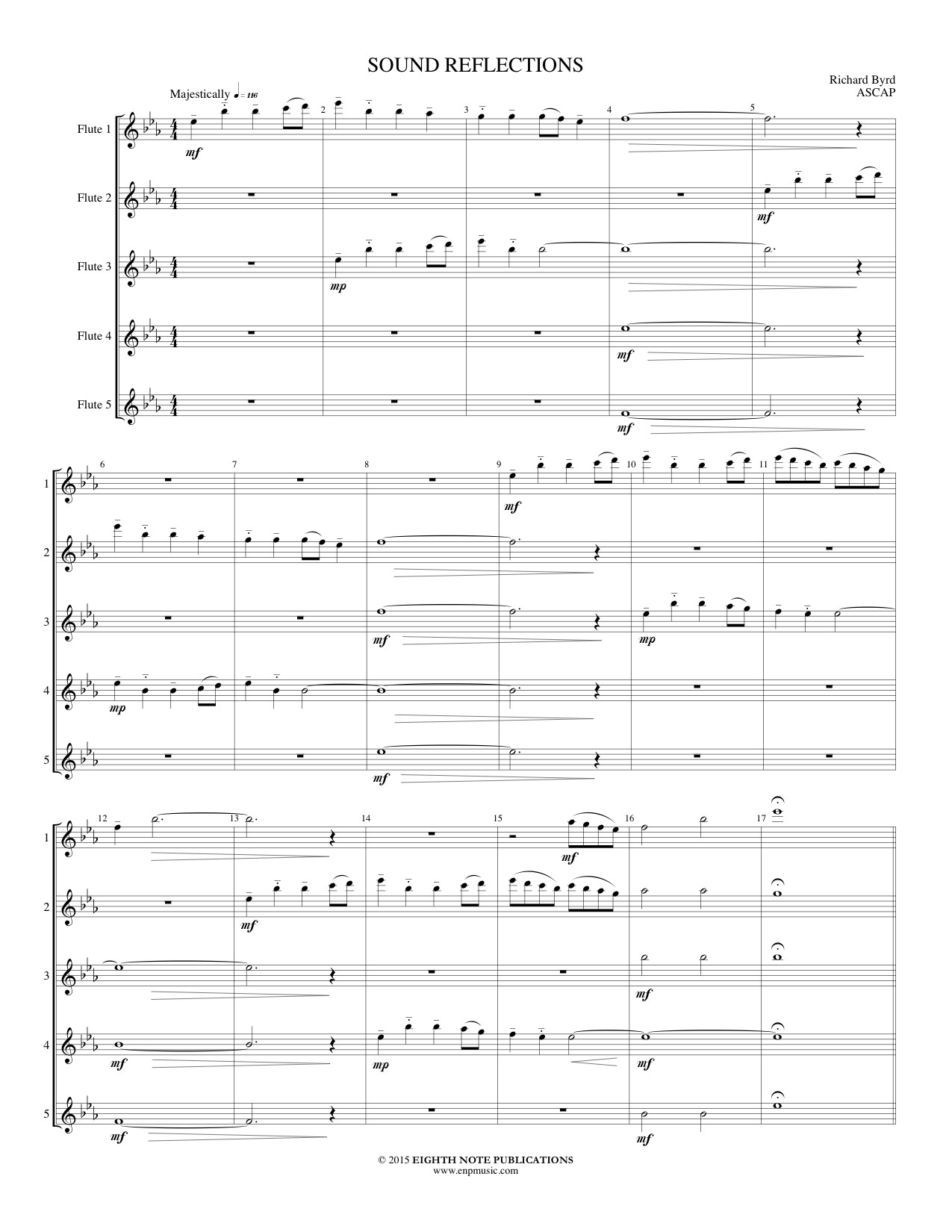The musical material for Sound Reflections was inspired after a trip to the Grand Canyon. The open voicings of quartal harmonies reflect the canyon s vast expanse. This work is fun to perform and enjoyable to hear, and is ideal for competitions, conference preludes and engaging concert programs. |