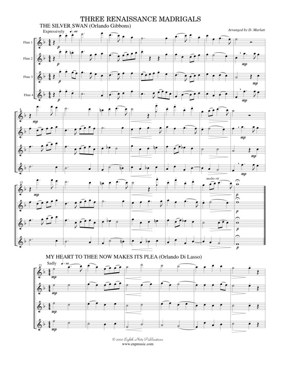 The Silver Swan, My Heart to Thee Now Makes its Plea and Now is the Month of Maying make up this set of famous madrigals for 4 flutes. There are two slower melodies and one fast one to add variety to this suite. A piece could be played by itself or all three could be played together as a set. These simple vocal pieces are excellent to develop ensemble playing techniques such as balance and intonation. This arrangement is part of an interchangeable set that can combine any number of instruments (flutes, clarinets, saxophones, trumpets, horns, trombones and tubas). |