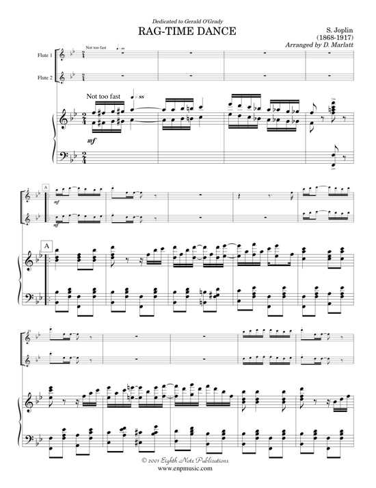 This is another famous Joplin rag which has been arranged here for 2 flutes and piano. The piano part remains in the original key and flutes play the famous melodic lines above the steady bass. The flutes and piano alternate melodic sections. Sometimes the piano plays alone and sometimes the flutes play the melody with the piano adding newly composed, stylistically accurate counter melodies. |