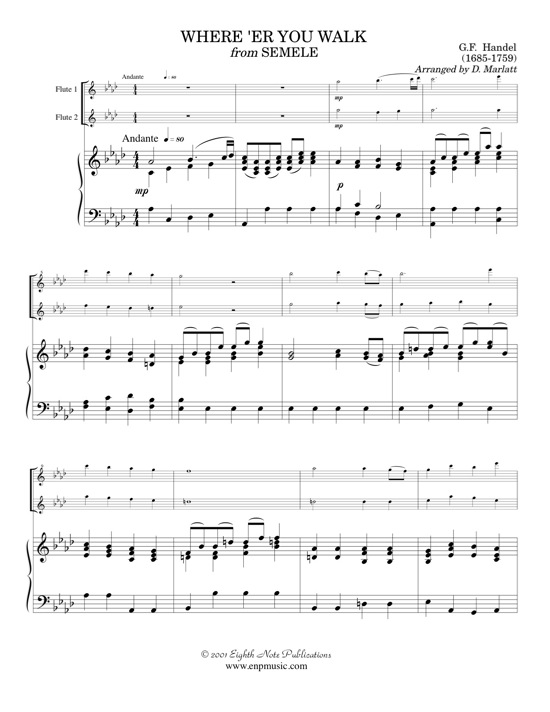 Set here for 2 flutes and keyboard, this famous piece makes a great duet for use at church, weddings or concerts. Handel's flowing melodic lines are supported by the keyboard part which could be played on either organ or piano.