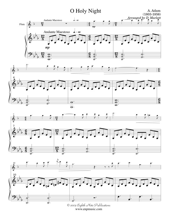 O Holy Night is one of the most popular and famous of all Christmas carols. Set here for flute and organ (or piano), the familiar melody soars with the sound of the flute. Range and control of sound are the two factors which make this piece difficult. This is a truly awesome work to be performed in a church during the holiday season. |