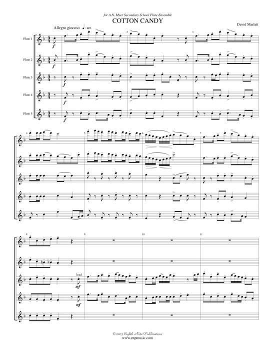 Cotton Candy is a quick, light and fun tune intended as a closer or encore on a concert. It is musically simple and the harmonies are typical of cartoon or circus music. The title suggests the gaiety that one would encounter at a town fair or circus, eating food that is nothing but sugar! This work is dedicated to the A.N Myer Secondary School Flute Ensemble. |