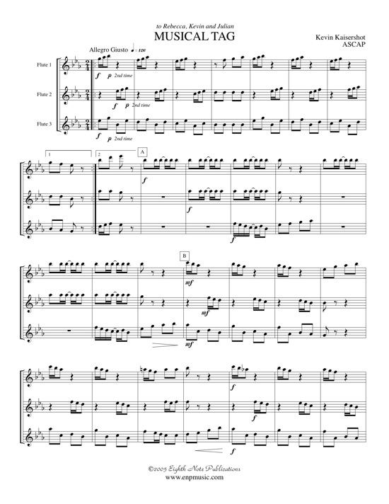 Musical Tag is a light-hearted work designed to provide some amusement amongst the performers by way of a "chase" between two voices with the third voice tagging along. Each voice is given melodic material at some point in the piece and the rhythmic skill being emphasized is the two sixteenth-eighth pattern, both ascending and descending.