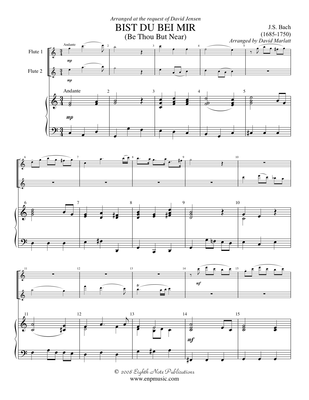 This beautiful melody is one of the pieces from the two music books which Bach wrote for his beloved second wife, Anna Magdalena. This incredibly popular work has been arranged for 2 flutes and piano.
