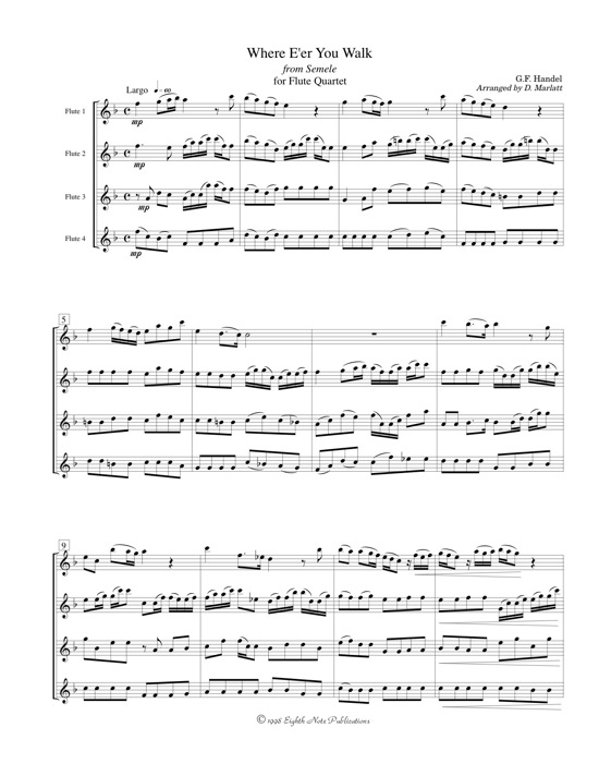 This popular aria is a beautiful addition to the music for flute ensemble. The lyrical side of the instrument is explored with the elegant melody of the solo line and the background figures that support the theme. Not too long nor too difficult, this could be played by a young flute quartet with some practice. |