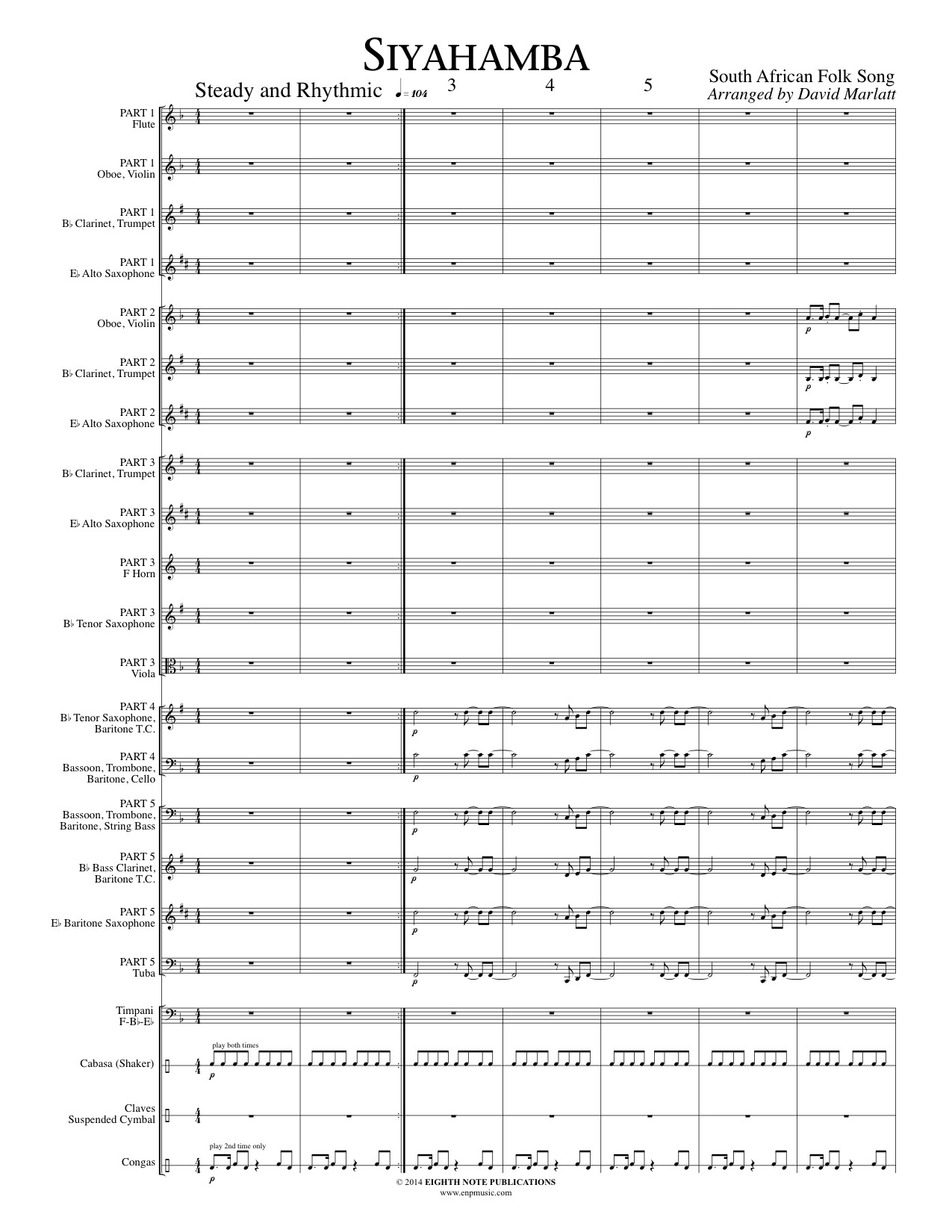 This is a traditional South African folksong that has been adapted and arranged for concert band. The authentic rhythmic backgrounds performed on a variety of percussion instruments add colour and interest. This is exciting music to add something really different to your next concert. |