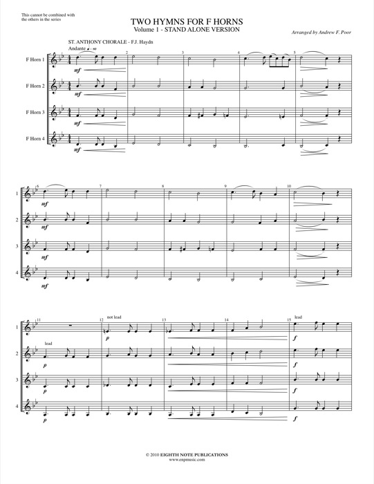 Each hymn was conceived as a four-part chorale to be used as both a warm-up selection and a piece that could be used to develop lyrical performance skills. Both hymns are personal favorites of the arranger, one from the orchestral canon and the other from the sacred hymnal - St. Anthony's Chorale and My Father's World.