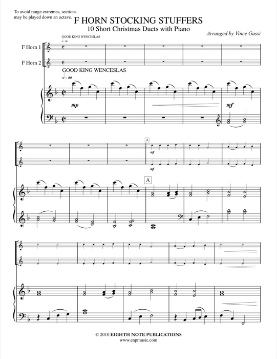 These arrangements are fun and easy and will make a perfect addition to any Christmas concert or holiday celebration. Also available with these arrangements are beautiful, lush orchestral accompaniment tracks available for free download from enpmusic.com or vincegassi.com. These stunning and colorful scorings would make a special addition to a church service or school event. Simply download whichever mp3 s you want and play them through speakers and have the instrumentalists play along. Pieces include: Good King Wenceslas, Holly and the Ivy, Huron Carol, Jingle Bells, O Christmas Tree, Silent Night, Up on the Rooftop, Little Drummer Boy, We Three Kings and Ding Dong Merrily on High.