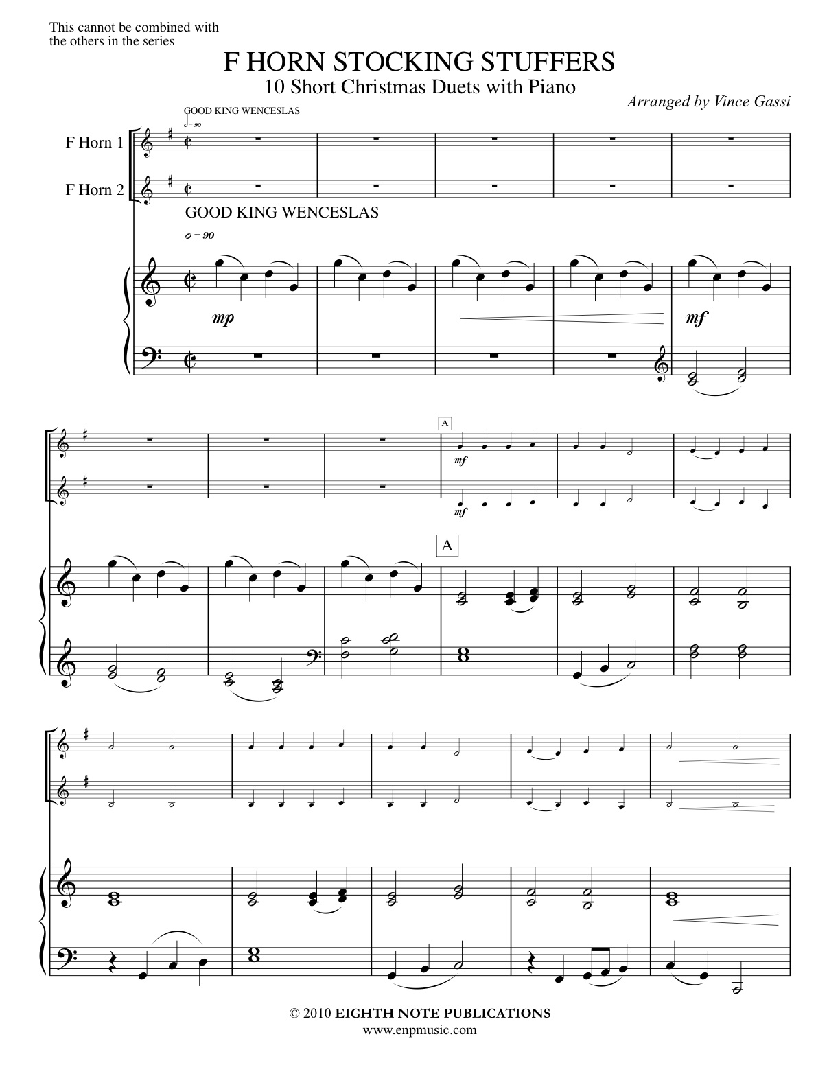 These arrangements are fun and easy and will make a perfect addition to any Christmas concert or holiday celebration. Also available with these arrangements are beautiful, lush orchestral accompaniment tracks available for free download from enpmusic.com or vincegassi.com. These stunning and colorful scorings would make a special addition to a church service or school event. Simply download whichever mp3 s you want and play them through speakers and have the instrumentalists play along. Pieces include: Good King Wenceslas, Holly and the Ivy, Huron Carol, Jingle Bells, O Christmas Tree, Silent Night, Up on the Rooftop, Little Drummer Boy, We Three Kings and Ding Dong Merrily on High.