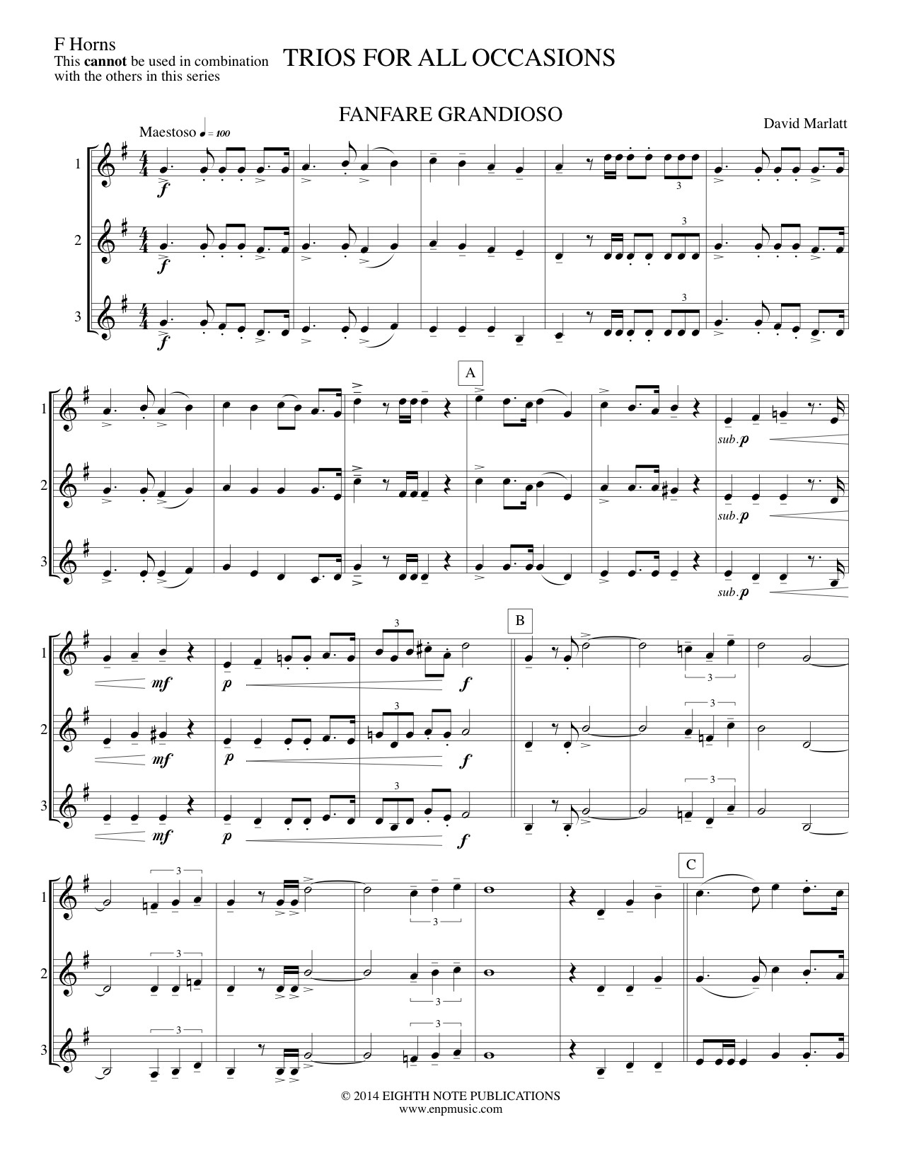 This is a collection of compositions and arrangements of well-loved music set for 3 like-instruments. The arrangements are suitable for a variety of performance situations such as school concerts, at church or on gigs in the community. Pieces included are: Fanfare Grandioso, Trumpet Voluntary, Ode to Joy, March Triumphant, Little Brown Jug, Allegro Maestoso from Water Music, Washington Post, Abide With Me, Still, Still, Still, Christ the Lord is Risen Today, Canon (Mozart), The Dwarfs March Home, The Entertainer and Brain Waves.