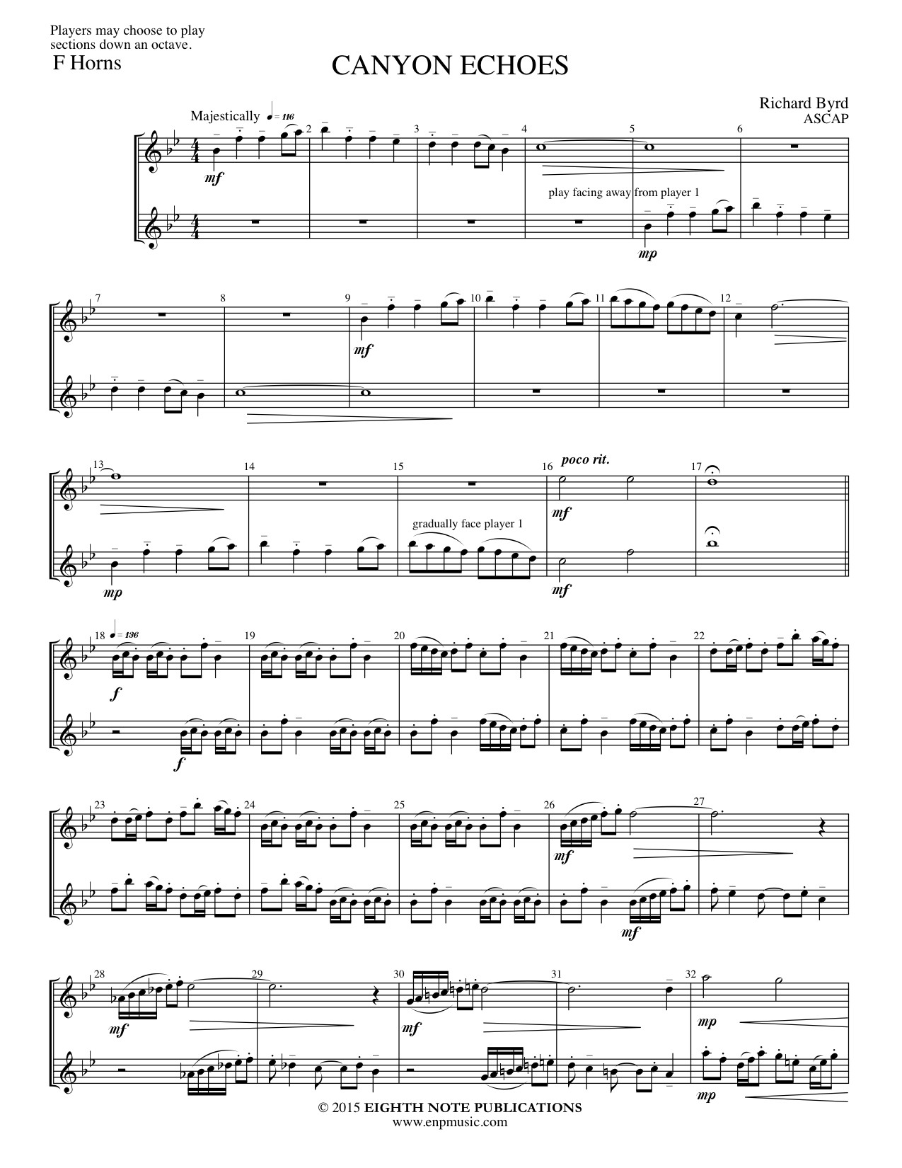 The musical material for Canyon Echoes was inspired after a trip to the Grand Canyon. The open voicings of quartal harmonies reflect the canyon s vast expanse. This work is fun to perform and enjoyable to hear, and is ideal for competitions, conference preludes and engaging concert programs.