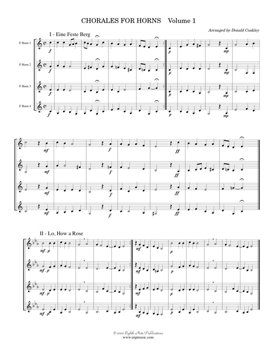 It seems only natural for arrangers to look to the choral repertoire to create sets of short chorales as warm ups or concert pieces. This collection takes some famous chorales from Luther, Praetorius and others and puts them together to form a practical and useful suite that is approachable by young musicians. This arrangement is part of an interchangeable set for 4 instruments that can combine any number of instruments (flutes, clarinets, saxophones, trumpets, horns, trombones and tubas).