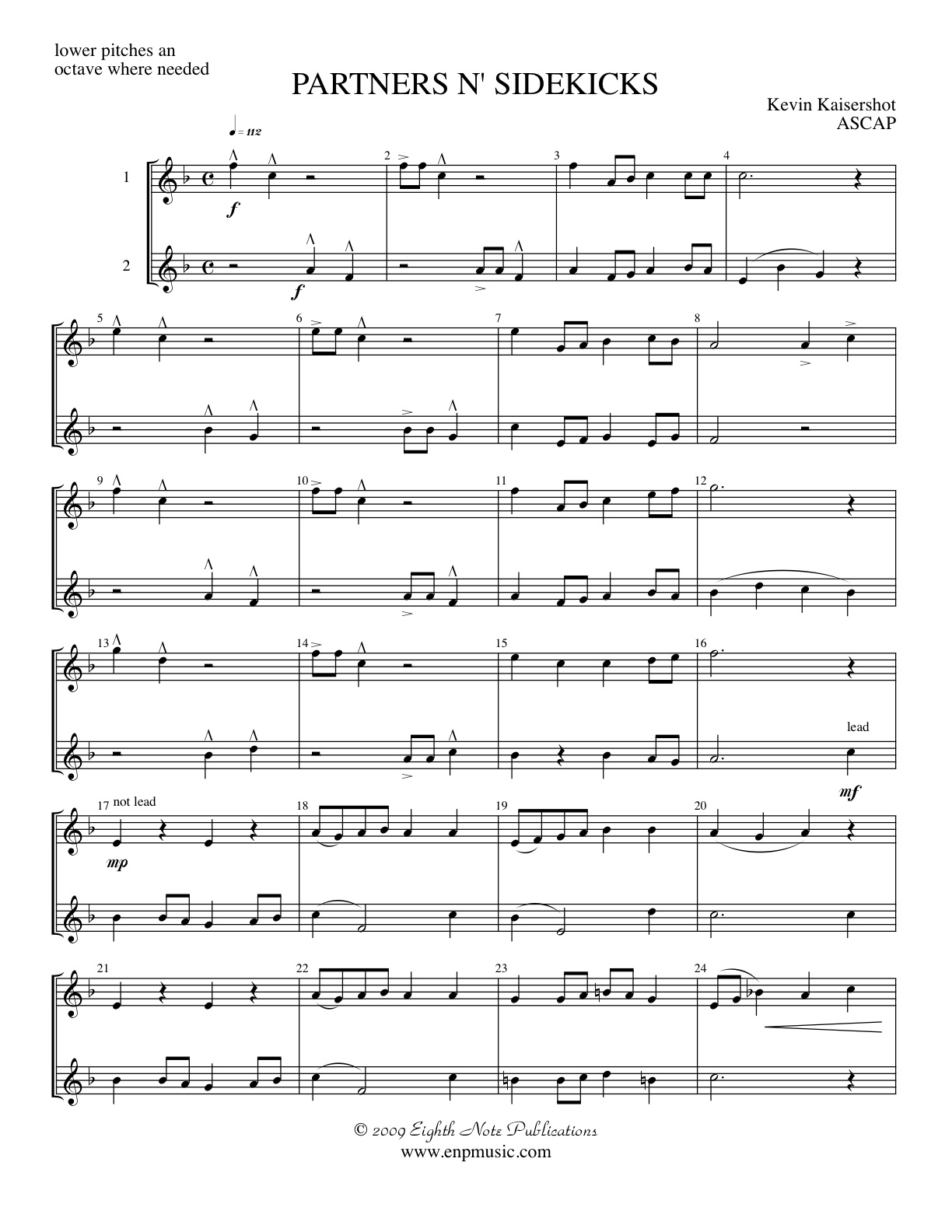 Designed for beginning level instrumentalists, Partners n Sidekicks was written for a couple of my former students whose musical energies were contagious. Though both very independent players (a skill that served them well as they progressed) they worked very well together, each challenging the other to be better. So it is with this piece that allows each performer to present the musical line as well as work together (in harmony) as the piece progresses.