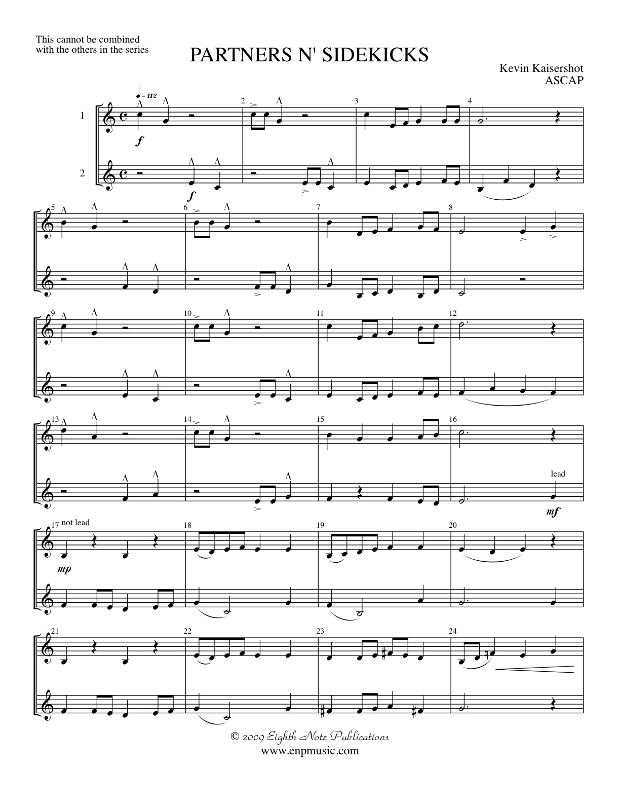Designed for beginning level instrumentalists, Partners n Sidekicks was written for a couple of my former students whose musical energies were contagious. Though both very independent players (a skill that served them well as they progressed) they worked very well together, each challenging the other to be better. So it is with this piece that allows each performer to present the musical line as well as work together (in harmony) as the piece progresses.