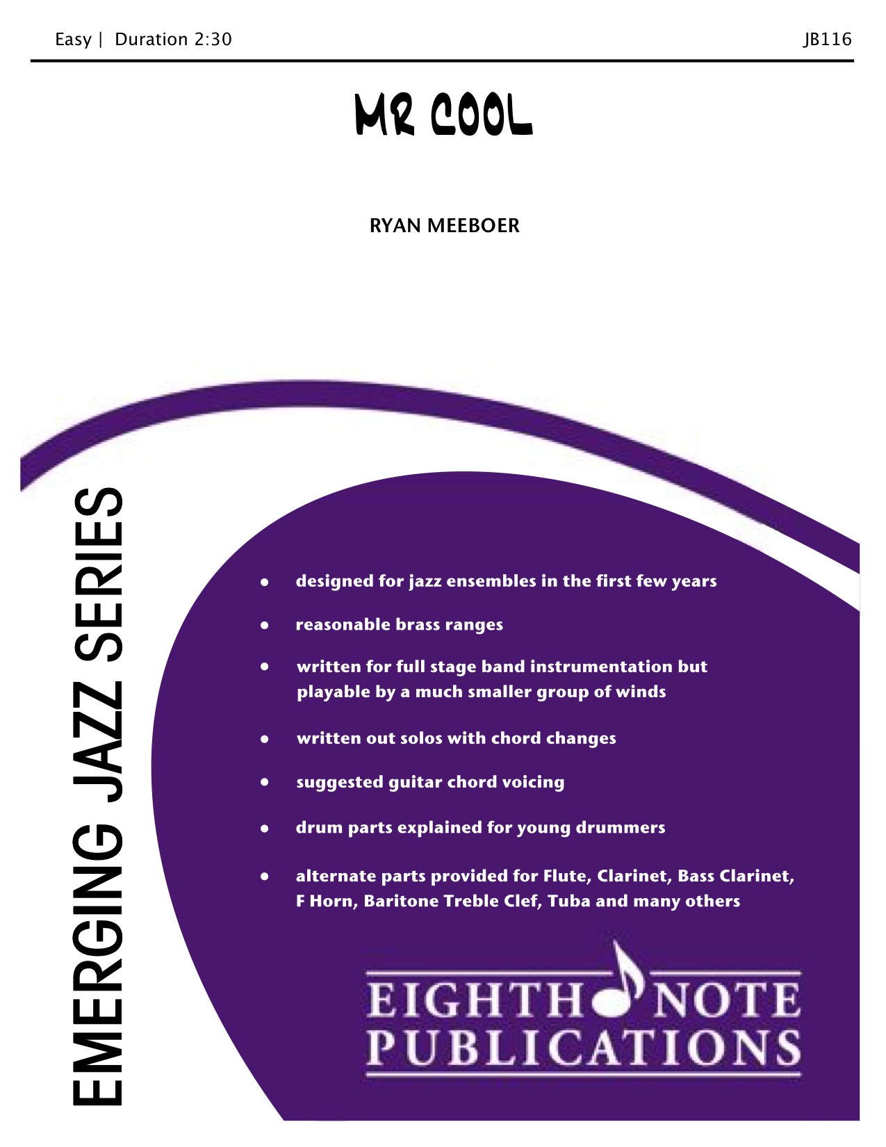 Mr. Cool is the perfect chart for directors to use when starting a jazz band for the first time. It is a modal straight riff tune that uses only one chord throughout. It is the perfect opportunity to focus on teaching the swing style, jazz articulations, and some opportunities to introduce improvisation to students who have little to no experience playing jazz.