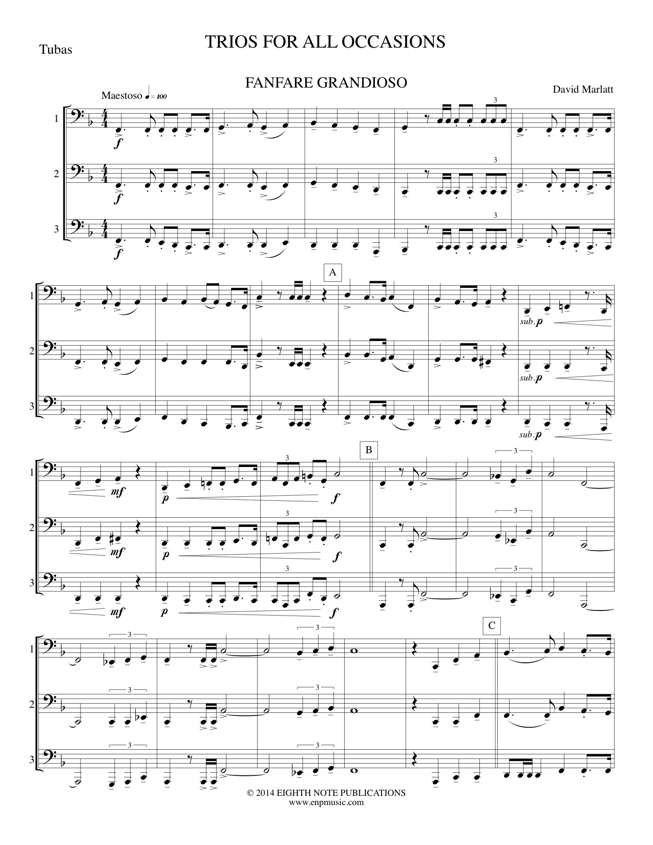 This is a collection of compositions and arrangements of well-loved music set for 3 like-instruments. The arrangements are suitable for a variety of performance situations such as school concerts, at church or on gigs in the community. Pieces included are: Fanfare Grandioso, Trumpet Voluntary, Ode to Joy, March Triumphant, Little Brown Jug, Allegro Maestoso from Water Music, Washington Post, Abide With Me, Still, Still, Still, Christ the Lord is Risen Today, Canon (Mozart), The Dwarfs March Home, The Entertainer and Brain Waves.