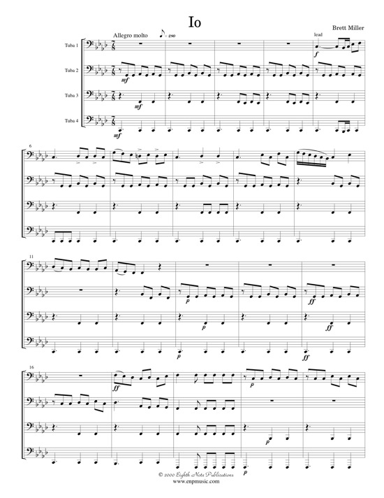 This energetic and driving original composition for low brass ensemble is a brilliant addition to the repertoire. All parts get a chance at melody in this multisectioned piece. Grooving rhythms in compound meters (7/8) add rhythmic variety and energy. Watch for other new compositions coming from this talented composer. |