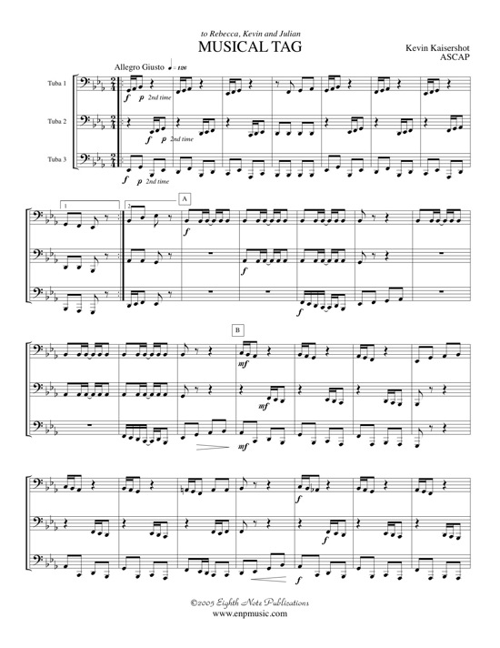 Musical Tag is a light-hearted work designed to provide some amusement amongst the performers by way of a "chase" between two voices with the third voice tagging along. Each voice is given melodic material at some point in the piece and the rhythmic skill being emphasized is the two sixteenth-eighth pattern, both ascending and descending.