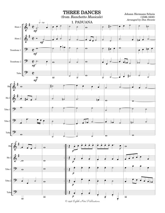 These three short dances are at a difficulty level that is approachable by mid high school level players. This unique combination of instruments (2 horns, 2 trombones, tuba) makes for an interesting sonority. Paduana, Gagliarda and Corrente make up this suite which is interesting for all players. |