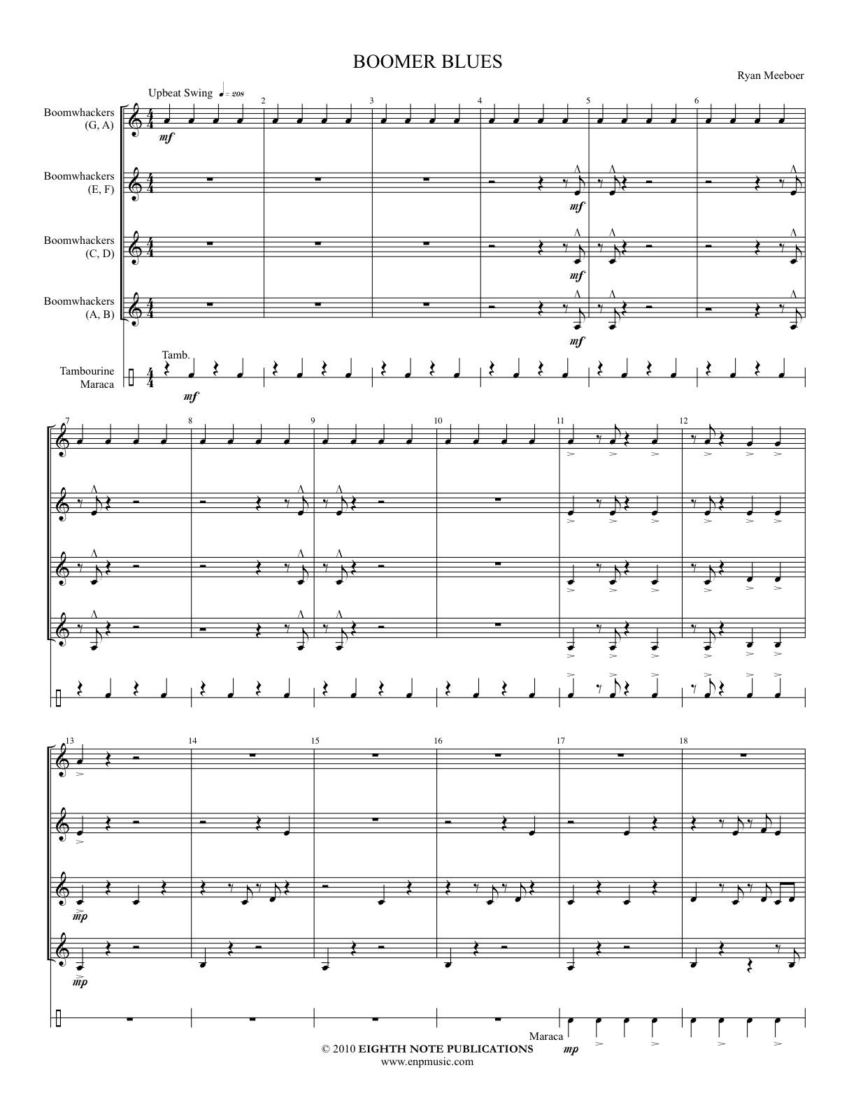 Boomer Blues is exactly what the title states, a 12-bar blues composed for boomwhackers. It is a fun upbeat tune where each player requires only two boomwhackers. After a short introduction, the pieces moves into a catchy riff before finally bringing in the main melody. After going through some variations of the tune and some call and response sections, the piece brings back the riff before closing. The tune is accompanied by a swing beat kept by only maracas and a tambourine playable by one performer. This piece requires 5 players. |