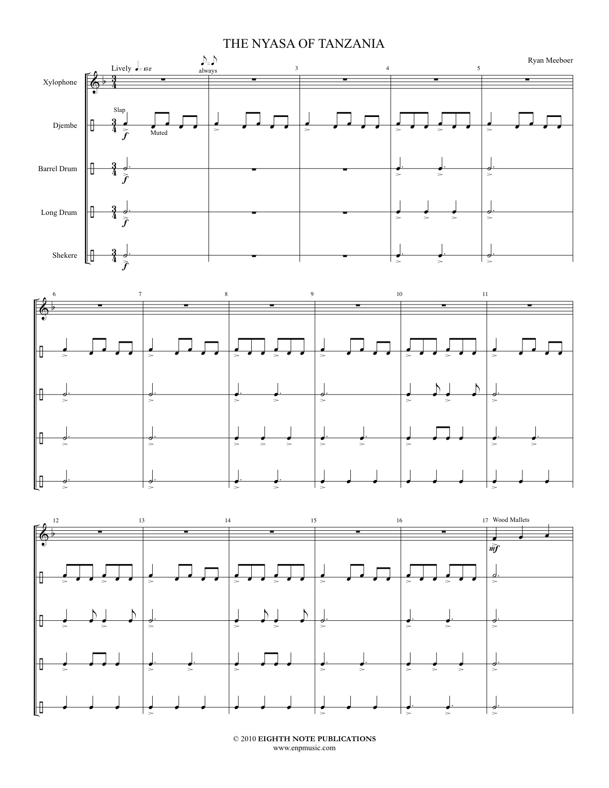 Based on the elements of traditional African music, Nyasa of Tanzania is a fun, polyrhythmic piece that is easy enough for an Orff ensemble to perform. The rhythms sound more complicated than they actually are and are easily teachable through rote. There is also opportunity for students to improvise in a call-response section. Although it is composed to use some traditional African instruments, it is possible to substitute standard percussion instruments where needed (conga or bongo for djembe, tom tom for barrel drum, bass drum for long drum, and maraca for shekere). |