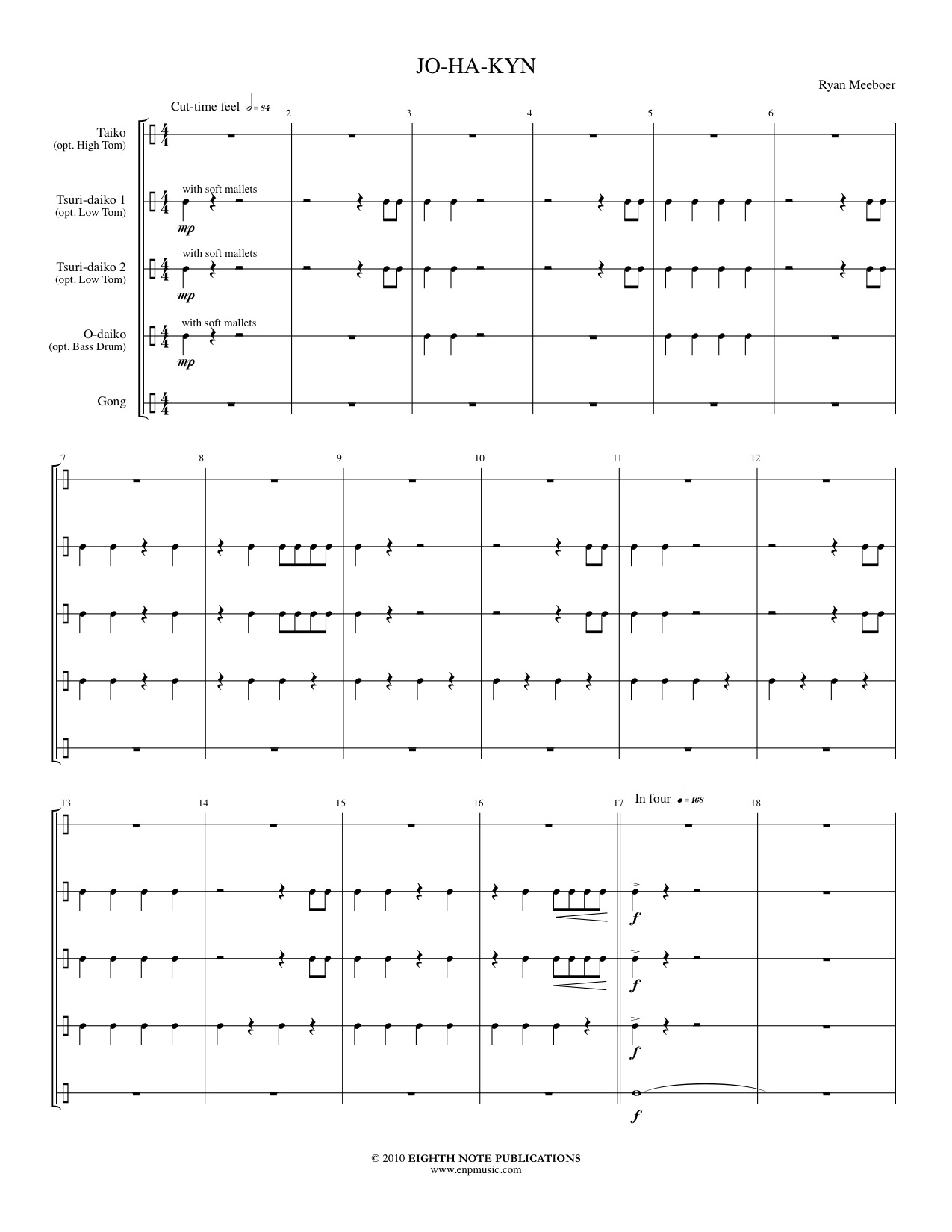 Inspired by the Japanese style of drumming, Jo-Ha-Kyn is a piece your percussionists will enjoy playing. It is based on the ternary structure where Jo is a slow introduction, Ha is a build up of the tempo, and Kyn is the great, climactic rush before slowing down at the end. Although traditional Japanese instruments are to be used, common percussion instruments can be used as substitutes. |