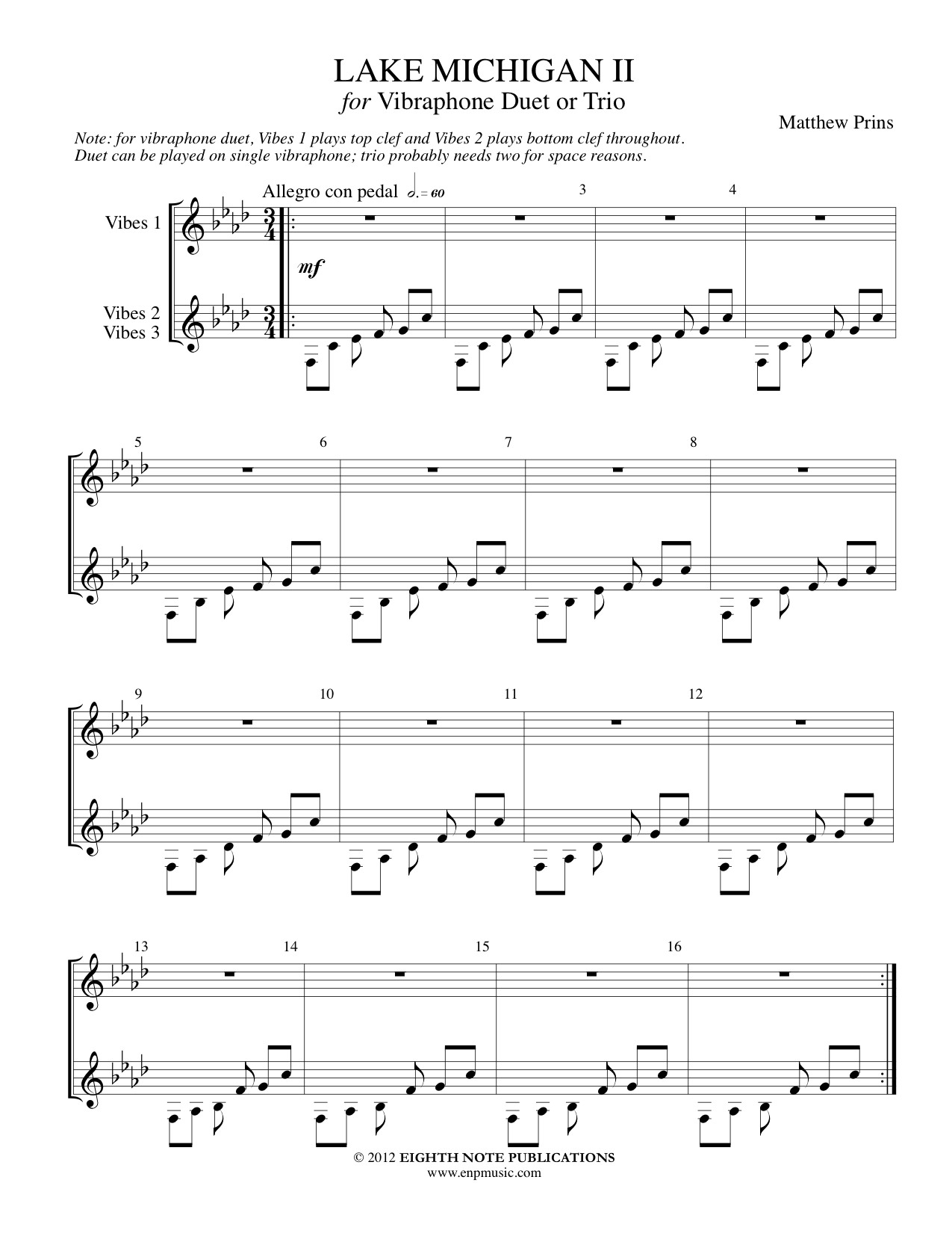 Lake Michigan II was inspired by the composer's trip to the western shores of the eponymous lake. The changing of the waves flowing back and forth is evoked by the two-against-three movement of the musical lines.
